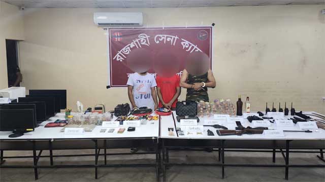 রাজশাহী নগরের বোয়ালিয়া থানাধীন দরিখরবোনা এলাকায় বিশেষ অভিযান চালিয়ে অবৈধ অস্ত্র ও বিস্ফোরক সংশ্লিষ্ট কার্যক্রমে জড়িত সন্দেহভাজন তিনজনকে আটক করেছে সেনাবাহিনী। এ সময় তাদের কাছ থেকে বিপুল পরিমাণ অস্ত্র ও বিস্ফোরক উদ্ধার করা হয়।