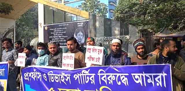 এ সময় তারা নানা স্লোগানে পরীক্ষায় অনিয়ম, জালিয়াতি ও প্রশ্নফাঁস হয়েছে জানিয়ে বাতিলের দাবি জানান।