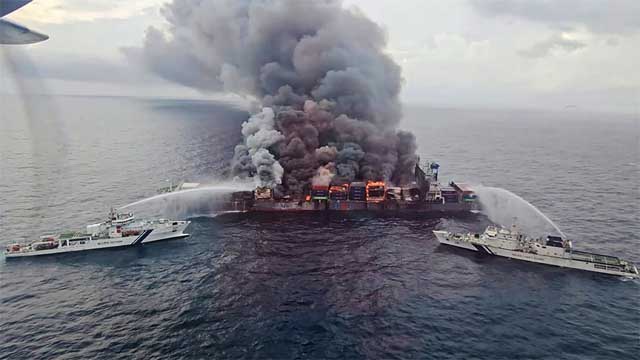উপকূলরক্ষী বাহিনী মঙ্গলবার জানায়, জাহাজটিতে এখনো ‘আগুন ও বিস্ফোরণ অব্যাহত রয়েছে’ এবং এটি প্রায় ‘১০ থেকে ১৫ ডিগ্রি হেলে গেছে’। তারা যে ছবি প্রকাশ করেছে, তাতে দেখা যায়, জাহাজের উপরিভাগে স্তূপ করে রাখা কনটেইনার থেকে আগুন বের হচ্ছে, আর চারপাশে ঘন কালো ধোঁয়ার কুণ্ডলি ছড়িয়ে পড়েছে।