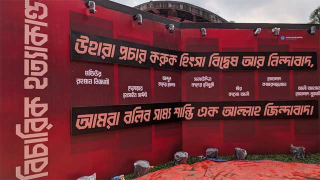 গতকাল ঢাকা বিশ্ববিদ্যালয় প্রশাসন বিশ্ববিদ্যালয়ের ছাত্র শিক্ষক কেন্দ্র (টিএসসি) থেকে শিবিরের প্রদর্শনীতে যুদ্ধাপরাধীদের দায়ে দণ্ডিতদের ছবি সরিয়ে ফেলার পর এবার সে জায়গায় নতুন লেখা বসিয়েছে ইসলামী ছাত্রশিবির।