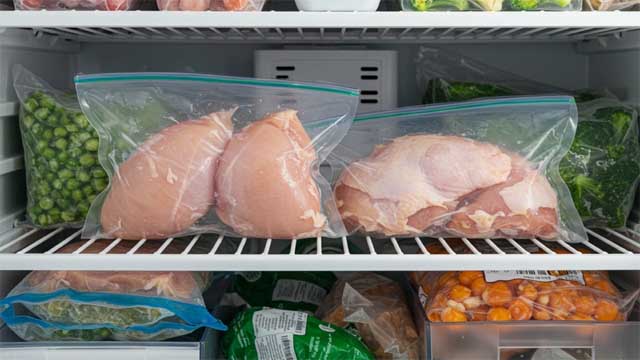 ডিপ ফ্রিজে কাঁচা মুরগি ৬ থেকে ৯ মাস, আর রান্না করা মুরগি ২ থেকে ৩ মাস পর্যন্ত সংরক্ষণ করা সম্ভব। সব সময় এয়ারটাইট ব্যাগ বা কন্টেনারে রাখুন, যেন বাতাস ঢুকতে না পারে।