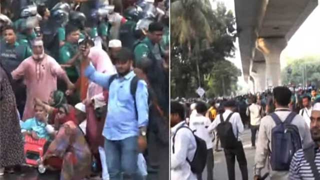 দশম গ্রেডে বেতনসহ তিন দাবিতে শাহবাগ অভিমুখে পদযাত্রায় বাধা দিয়েছে পুলিশ। এসময় সাউন্ড গ্রেনেড, জলকামান ব্যবহার করে পুলিশ। শনিবার (৮ নভেম্বর) বিকালে কেন্দ্রীয় শহীদ মিনার থেকে সরকারি প্রাথমিক বিদ্যালয়ের সহকারী শিক্ষকরা এ পদযাত্রা শুরু করে কিছু দূর যাওয়ার পর পুলিশ তাতে বাধা দেয়। ব্যারিকেড ভাঙার চেষ্টায় পুলিশ সাউন্ড গ্রেনেড ও জলকামান নিক্ষেপ করে তাদের ছত্রভঙ্গ করে দেয়।