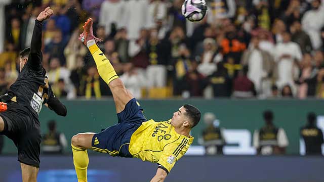 সৌদি প্রো লিগে আল খালেজের বিপক্ষে ম্যাচে দেখা গেছে রোনালদোর বাইসাইকেল কিকে গোল করার এই দৃশ্য। ম্যাচের যোগ করা সময়ের খেলা চলছিল তখন। ৩–১ গোলে এগিয়ে থাকা আল নাসরের জয় কেবলই সময়ের ব্যাপার। এমন সময় ম্যাচের ৯৬ মিনিটে আক্রমণে ওঠে আল নাসর। দলীয় আক্রমণে ডান প্রান্তে বক্সের বাইরে বল পান বদলিতে নামা নাওয়াফ বাওশাল।
