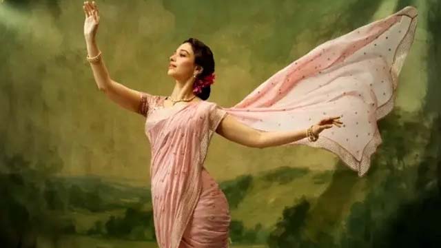 সেই নারীর চরিত্রেই পর্দায় হাজির হবেন তামান্না। তার নতুন পোস্টারে তাকে গোলাপি নউবারি শাড়িতে দেখা গেছে। পুরনো দিনের ভারতীয় সিনেমার আবহ ফুটে উঠেছে পুরো লুকে।