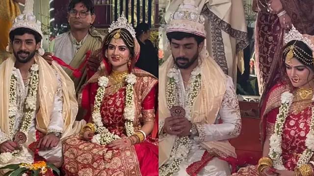 সব জল্পনার অবসান ঘটিয়ে ফের বিয়ের পিঁড়িতে বসলেন টালিউডের জনপ্রিয় অভিনেত্রী মধুমিতা সরকার। শুক্রবার সরস্বতী পূজার শুভ লগ্নে দীর্ঘদিনের প্রেমিক দেবমাল্য চক্রবর্তীর সঙ্গে কাগজে-কলমে সাত পাকে বাঁধা পড়লেন তিনি। বিয়ের আসরে মধুমিতা ধরা দিয়েছিলেন চিরায়ত বাঙালি কনের সাজে। পরনে লাল টুকটুকে বেনারসি, গা ভর্তি সোনার গয়না আর কপালে সূক্ষ্ম চন্দনের আলপনা—সব মিলিয়ে যেন এক মায়াবী রূপ।